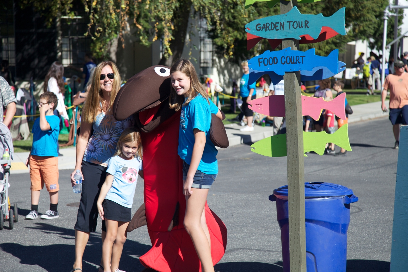 Children parade with costumes, and visit with salmon costumed performers. Pacific Northwest Fisheries.