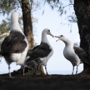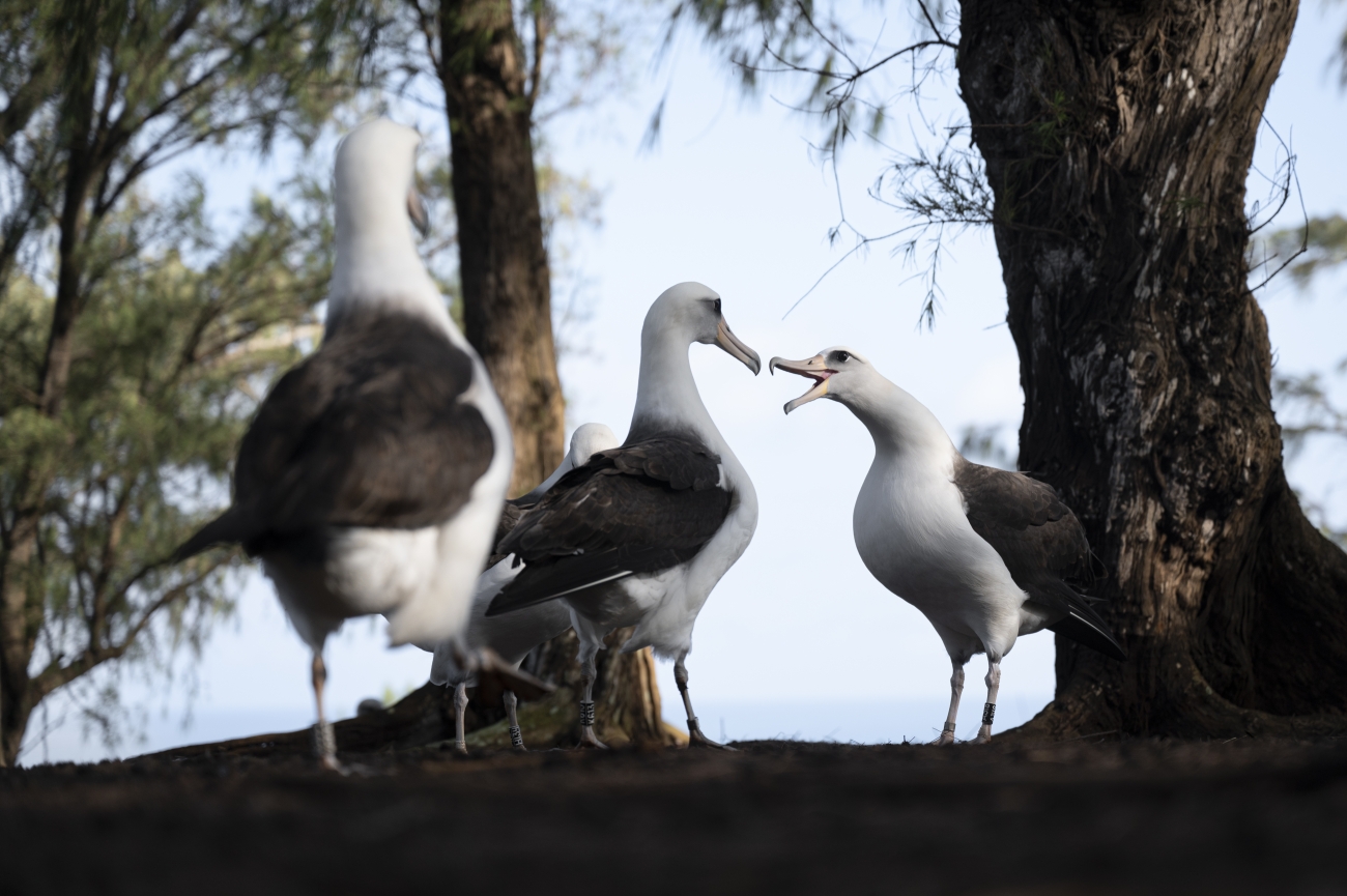 Mōlī or Laysan albatross perform complex courting rituals, including head bobbing, rapid beak clapping, and sky-pointing at Kīlauea Point National Wildlife Refuge. Both male-female and female-female breeding pairs bond will begin their pair bonding with these same rituals.
