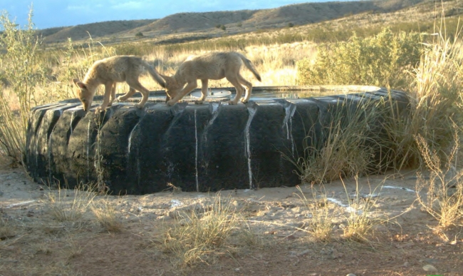 Coyote pups explore an abandoned tire on the Sevilleta National Wildlife Refuge.