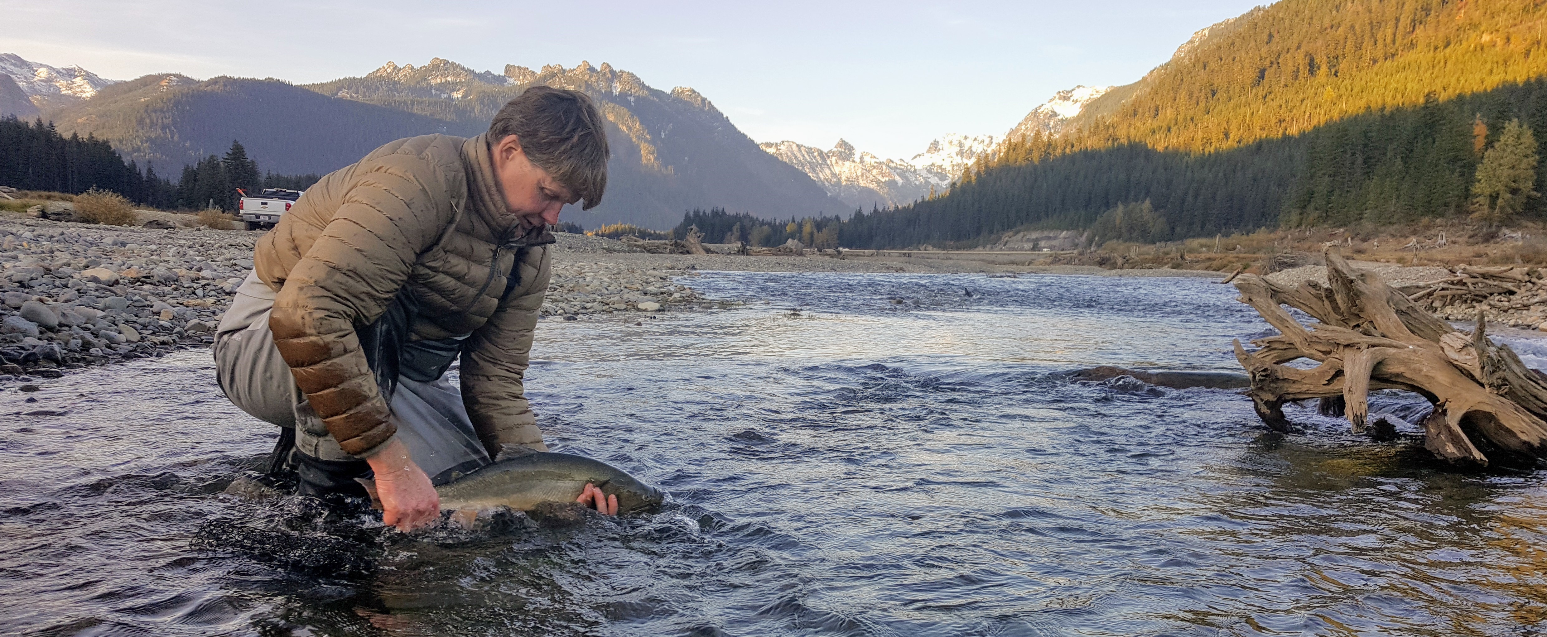 Craig Haskell from the Mid-Columbia Fish and Wildlife Conservation Office releasing one of eight bull trout into Gold Creek. This fish was captured in a stretch of the river which is isolated from spawning habitat by dams, and genetic data were used to determine which dam to pass the fish above.