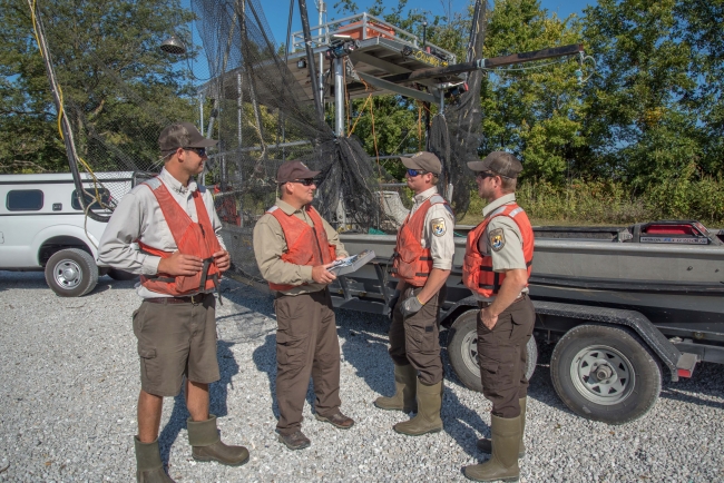 Crew of the U.S. Fish and Wildlife Service boat, The Magna Carpa, safety briefing.