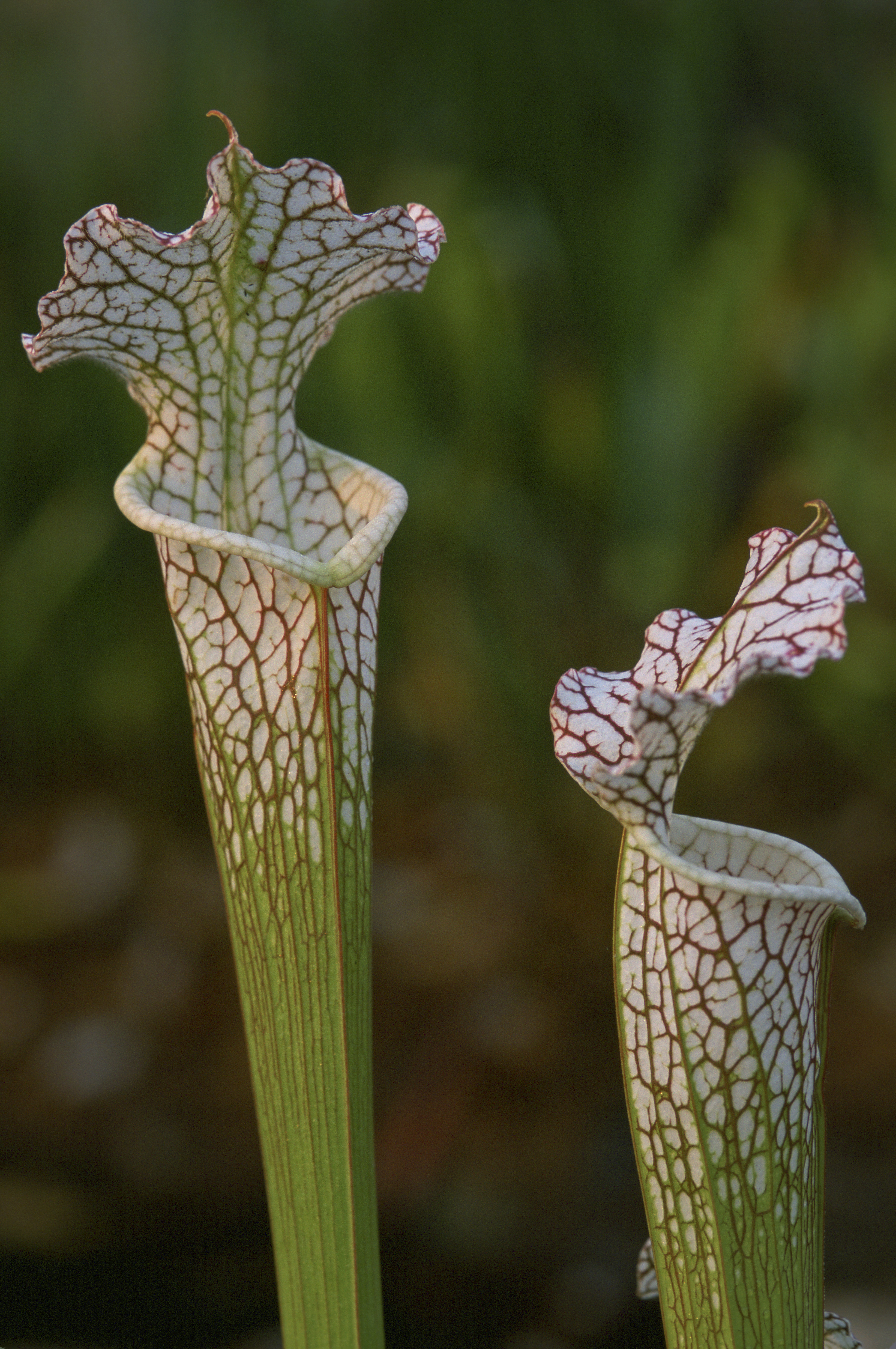 The Crimson Pitcher Plant is a carnivorous plant with tall, pitcher-like leaves with red lines that produce nectar and in turn attract insects to fall into the tall, hollow tube that collects rainwater.