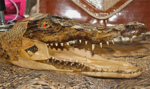 Ashtray made out of a crocodile head on display as part of the Service's "Buyer Beware" exhibit located in Logan airport, Boston, MA. The exhibit is designed to educate travelers about the hazards of purchasing wildlife products abroad that are made from endangered or protected species.