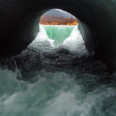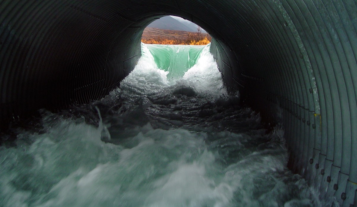 This culvert's water flow is perhaps appropriate for a water amusement park, but not so much for fish. Velocity barriers at undersized culverts stand in the way of fish reaching key habitats. Photo courtesy of Alaska Department of Fish and Game.