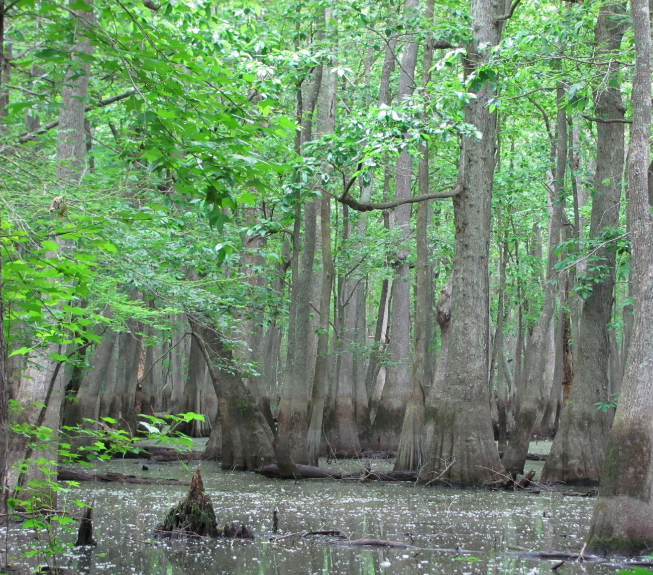 The thick "buttressed" bases of the trunks of cypresses and tupelos provided added stability in weak, muddy ground. Bottomland hardwood swamps are frequently flooded and provide valuable wetland habitat for herons, egrets, wood ducks, and other wildlife.
