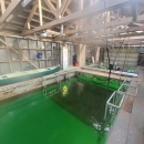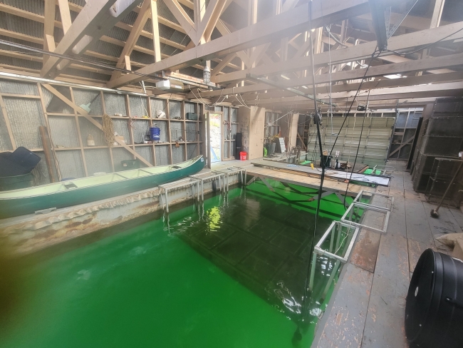 Display of suspended mussel cages on Dale Hollow Lake with the upgrades to the building borrowed from US Army Corps of Engineers