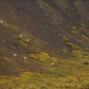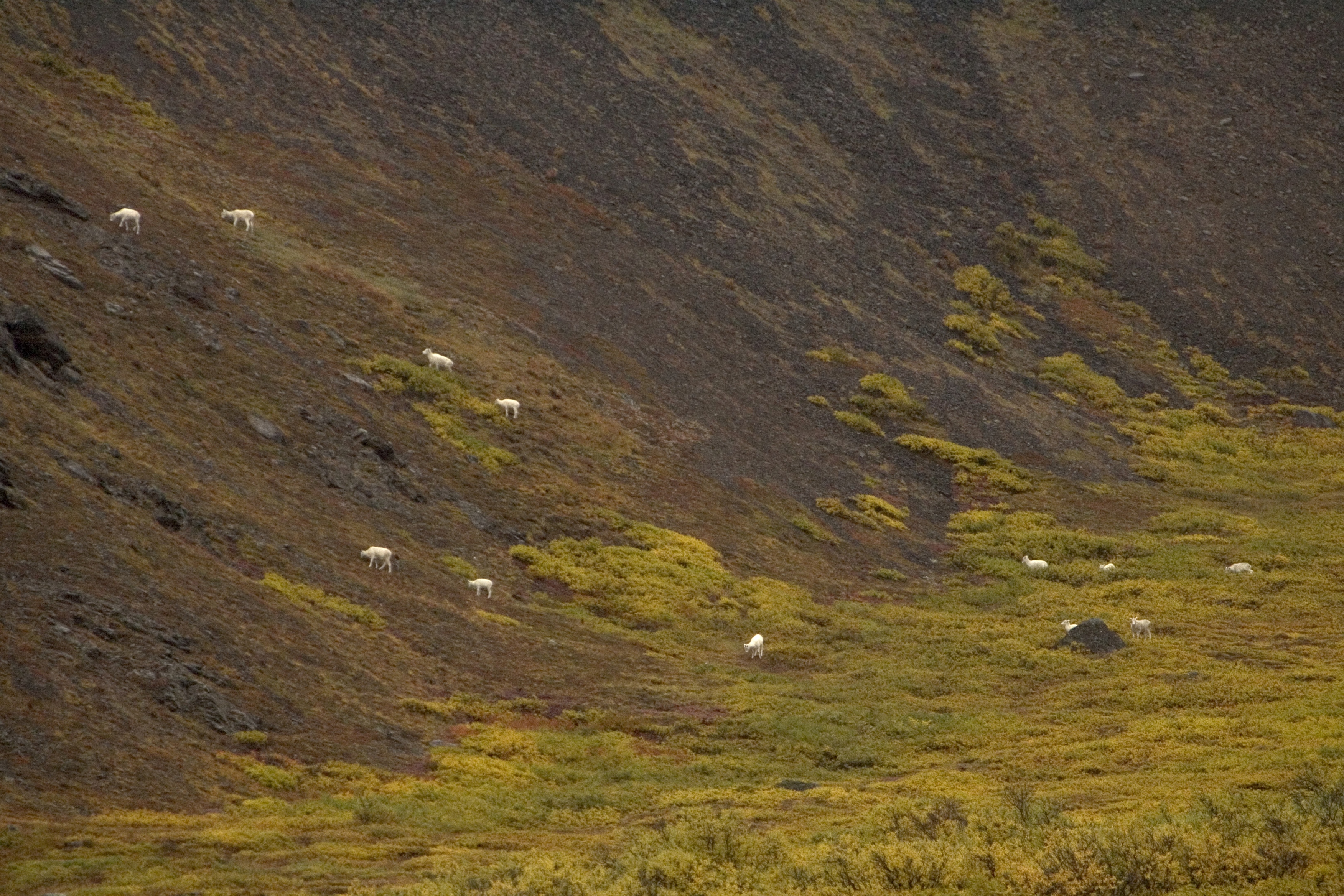 Dall sheep on a steep slope at Arctic National Wildlife Refuge. This refuge is a vast and beautiful wilderness with an intact continuum of six different ecological zones spanning some 200 miles north to south. Such a diverse spectrum of habitats and associated fish and wildlife populations within a single conservation area is unparalleled in the circumpolar north.