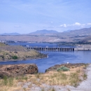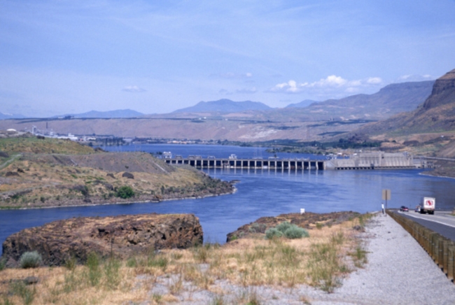 Hydro-electric dam on the Columbia River, showing dam in distance in relation to surrounding geography. Date of orginal is 1990's.