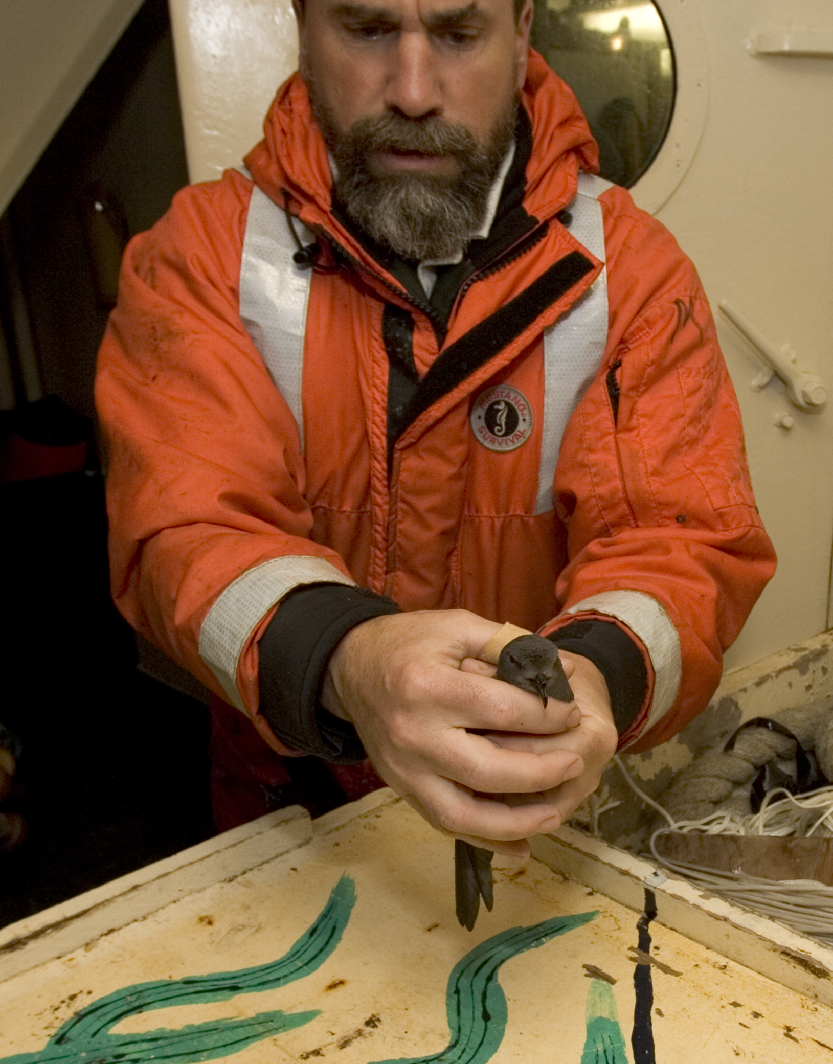 USFWS employee Dan McNulty holding a fork-tailed storm-petrel in his hands.