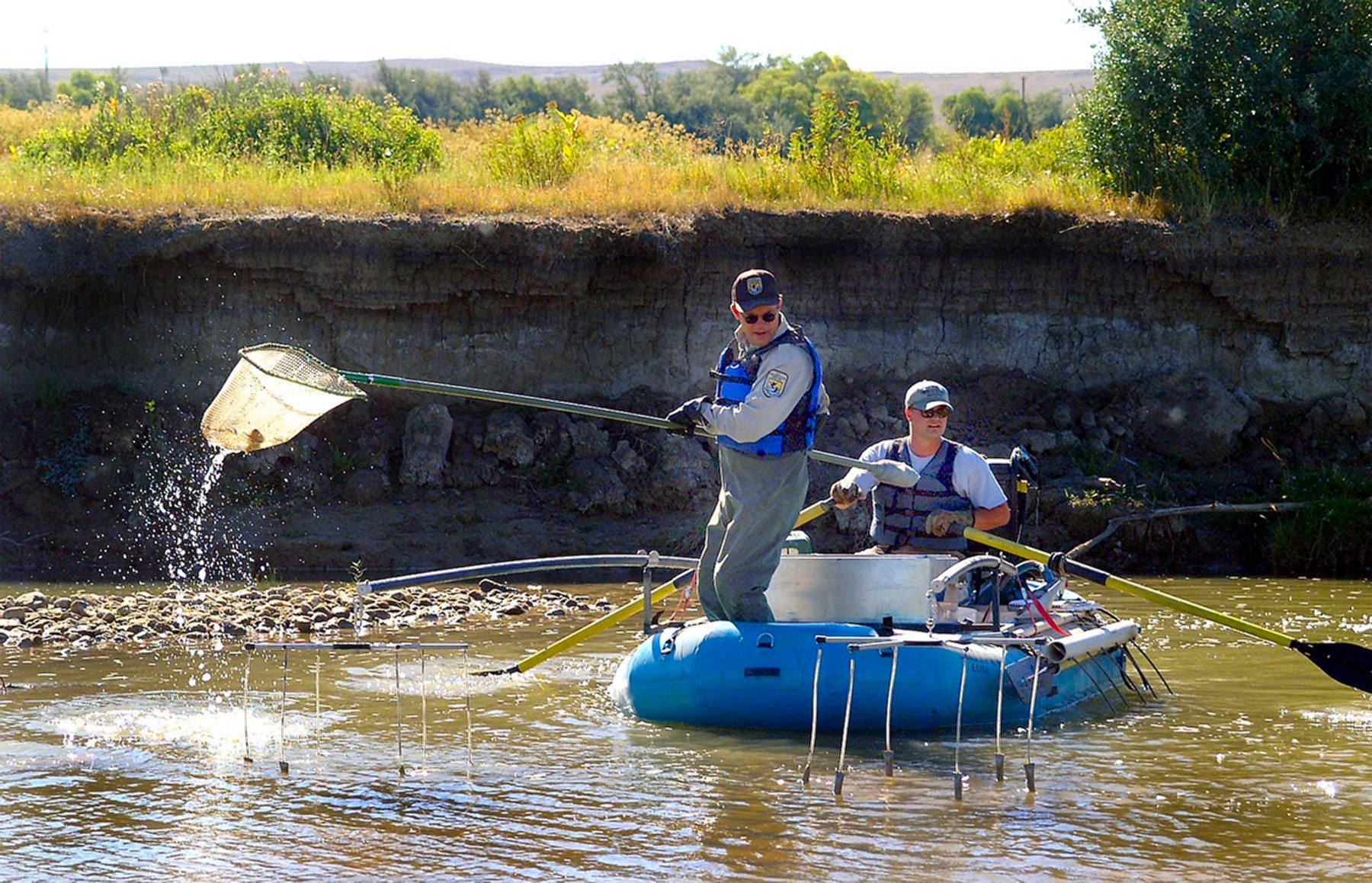 Raft electrofishing for sauger on the Little Wind River of the Wind River Indian Reservation.
