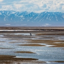 Research biologists pause among the wetlands of the coastal plain, with the Brooks Range in the background. During the short field research season, the biologists live and work in this remote camp at the edge of the continent.