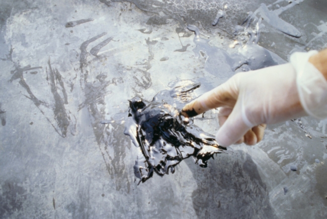 Gloved hand pointing to bird carcass covered in thick oil in oil pit. Dave of original is 1990's.