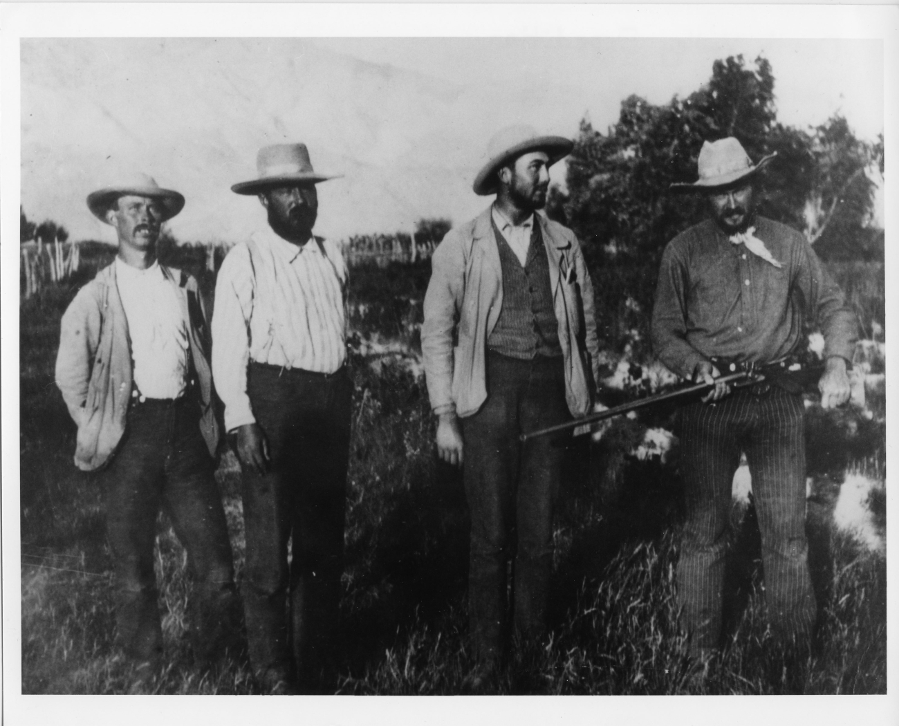 The Death Valley Expedition. From left: Vernon Bailey (Naturalist), Dr. Albert K. Fisher (Ornithologist), Dr. Theodore S. Palmer (Zoologist), and Dr. C. Hart Merriam (head of the Bureau of Biological Survey, 1885-1910). Owens Valley near Lone Pine, California. June 13, 1891.
