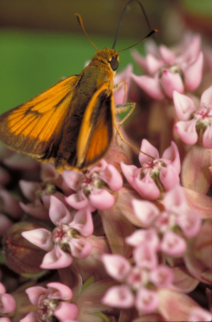 Male with orange wings accented with soft brown veining and edges, on pink blossoms, viewed from rear right side.
