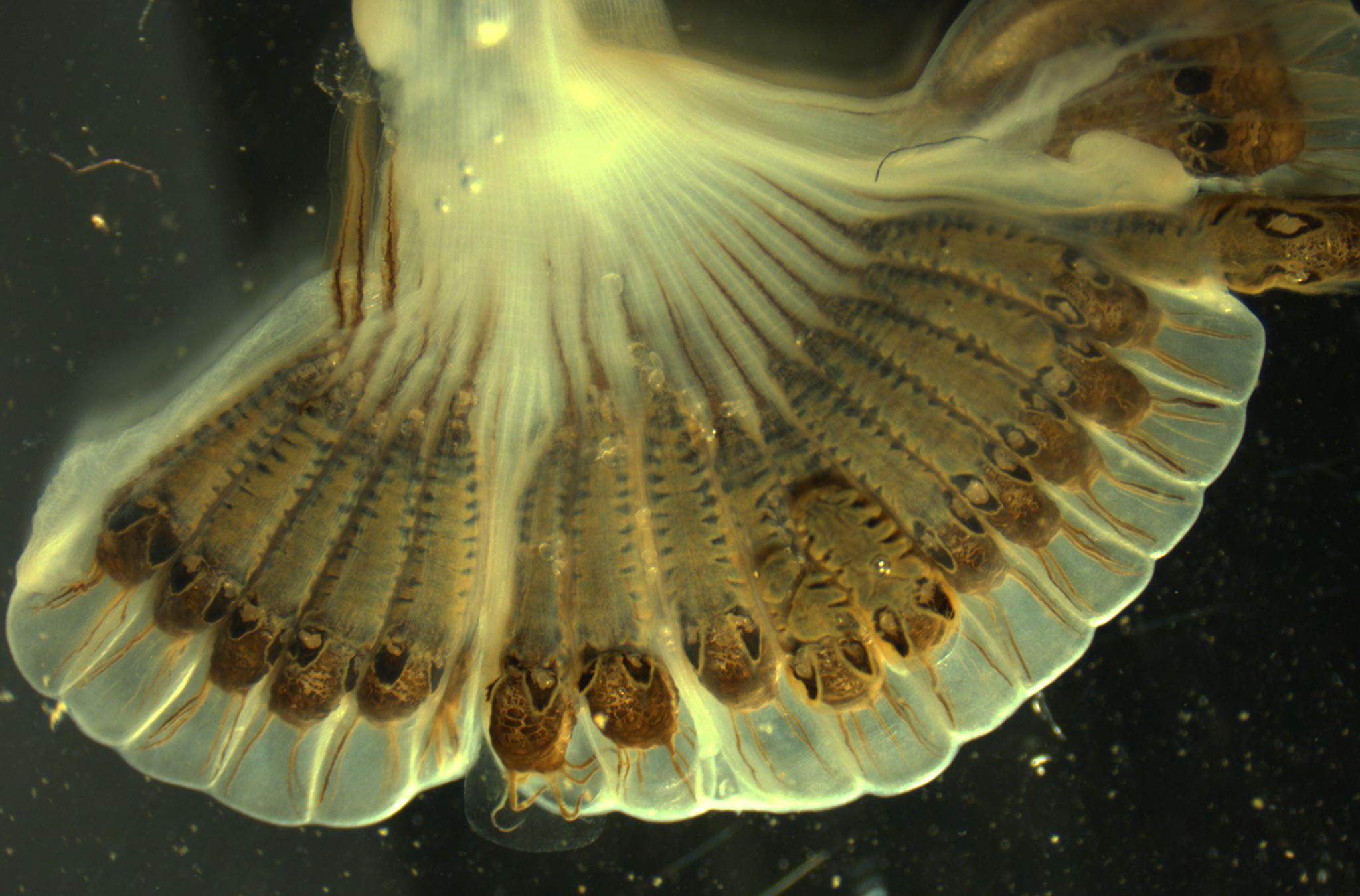 The demersal conglutinate of the fluted kidneyshell (Pytchobranchus subtentum). The conglutinate closely resembles the pupal stage of a black fly. Photo: Rachel Mair, USFWS.