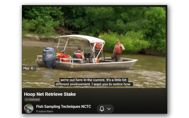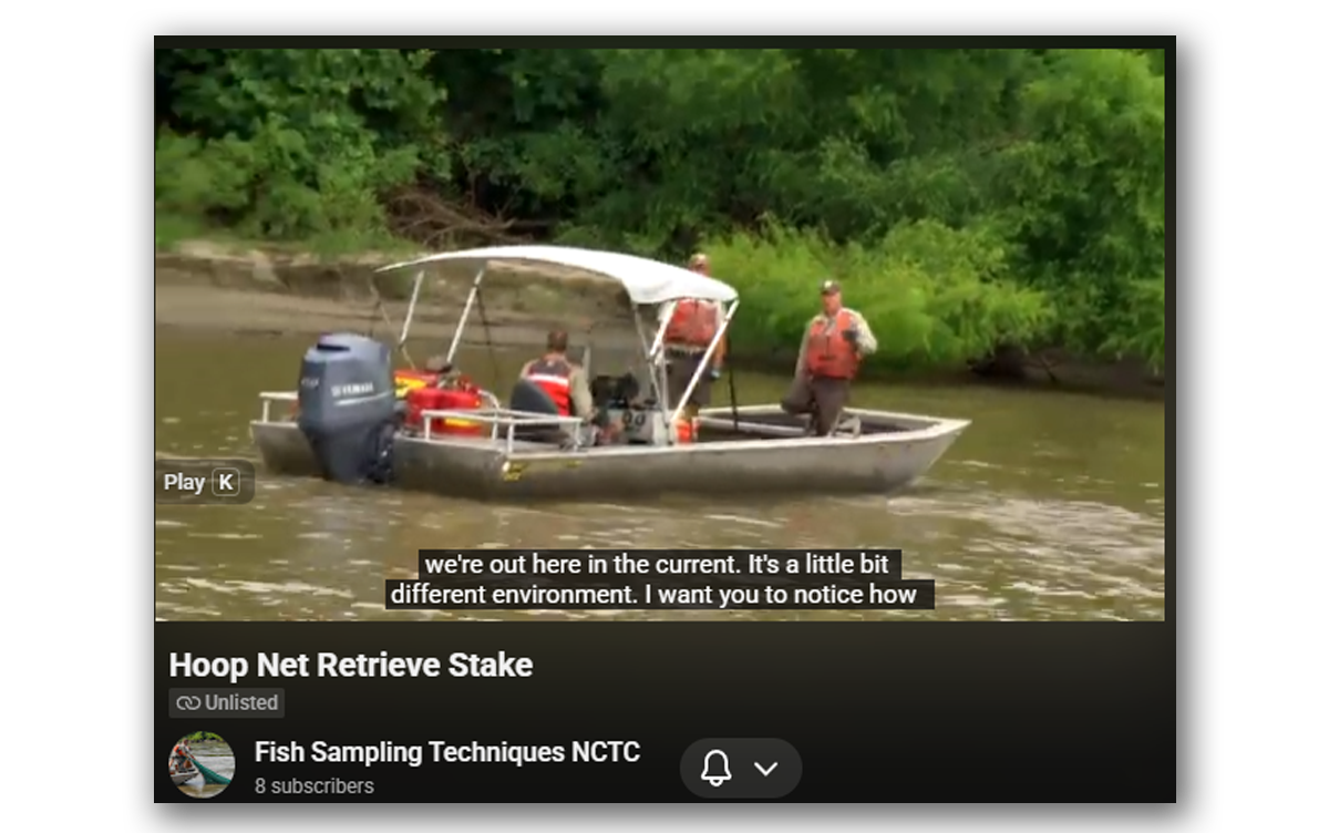Deployment in swift current, intermediate-sized hoop net, using a stake for cod end, double floats