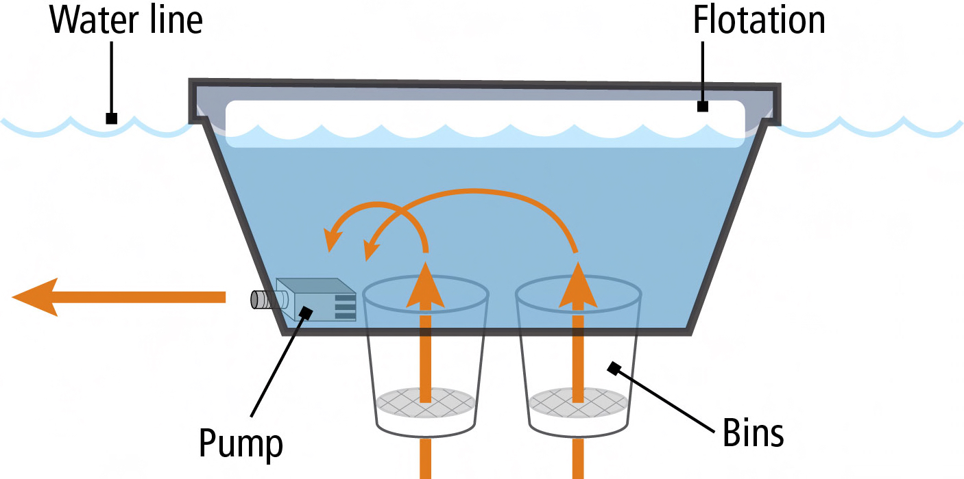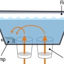 A diagram showing the design and water movement in a FLUPSYS. A submersible pump bails water out of the main tank and forces new water up through the culture chambers. Diagram courtesy of Dr. Chris Barnhart (Missouri State University) and adapted by Kristin Simanek, USFWS.