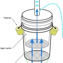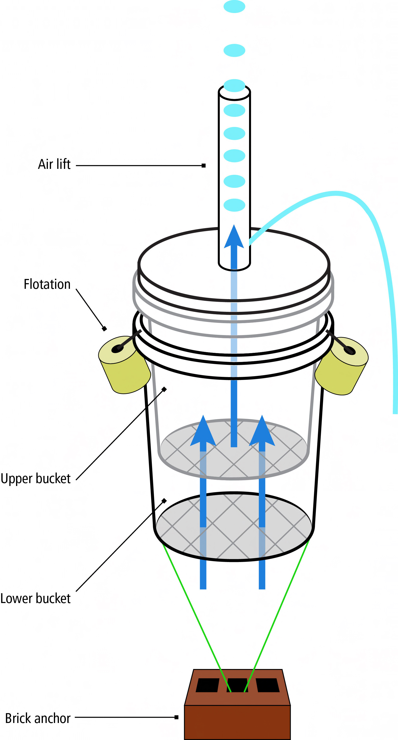 Diagram of the original SUPSY design at the Alabama Aquatic Biodiversity Center (Marion, Alabama) showing the direction of water flow. An air lift bails water out of the bucket, forcing water to upwell through the culture container. The brick anchor keeps the SUPSY in place while flotation keeps the system off the bottom of the pond. Diagram courtesy of Paul Johnson (Alabama Aquatic Biodiversity Center) and adapted by Kristin Simanek, USFWS.