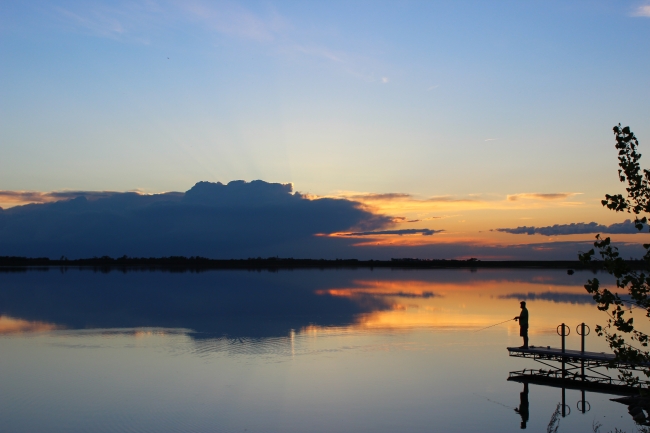 A fisherman enjoys the serenity of a calm evening and smooth waters on Diamond Lake in the Kulm Wetland Management District, North Dakota.