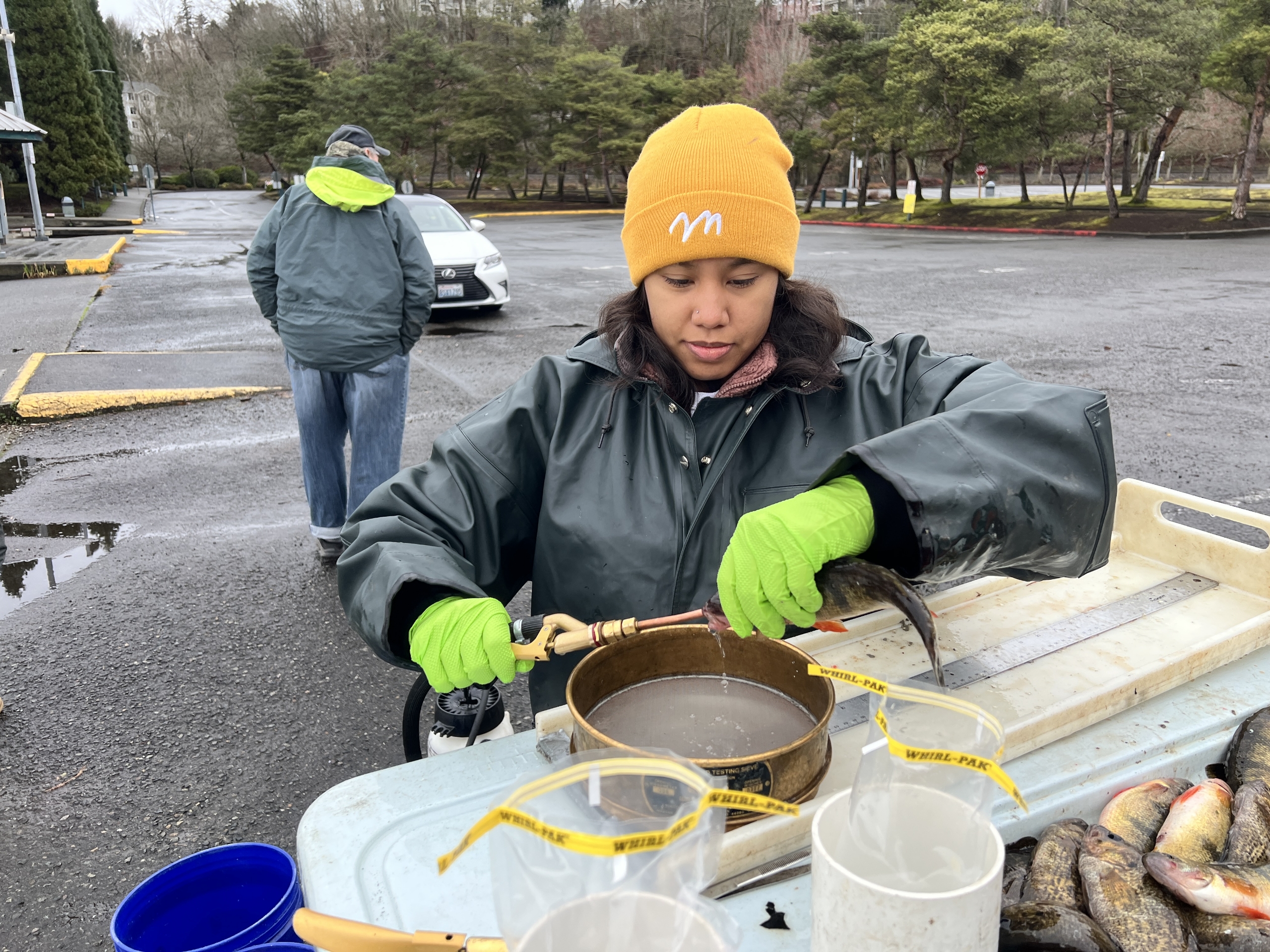 AmeriCorps intern, Charlotte Foster, collecting a diet sample from a invasive fish.