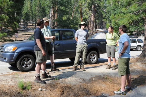Discussing last minute details.Hiking to Center Basin through Sequoia and Kings Canyon National Parks. National Park Service frog survey crew along on hike.