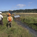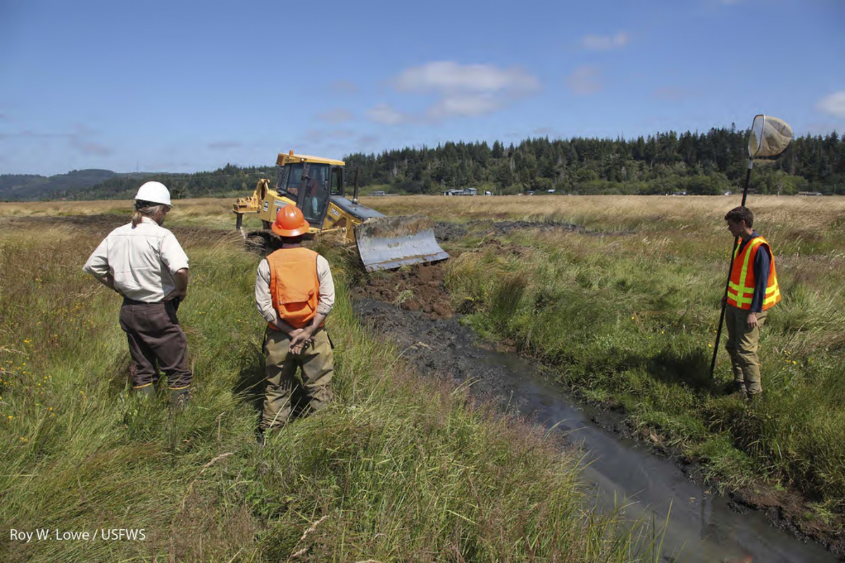 U.S. Fish and Wildlife Service and Oregon Department of Fish and Wildlife biologists monitoring ditch filling. Ditches are filled slowly to pushing any fish downstream out of the construction area. Fish are also captured and relocated when necessary.