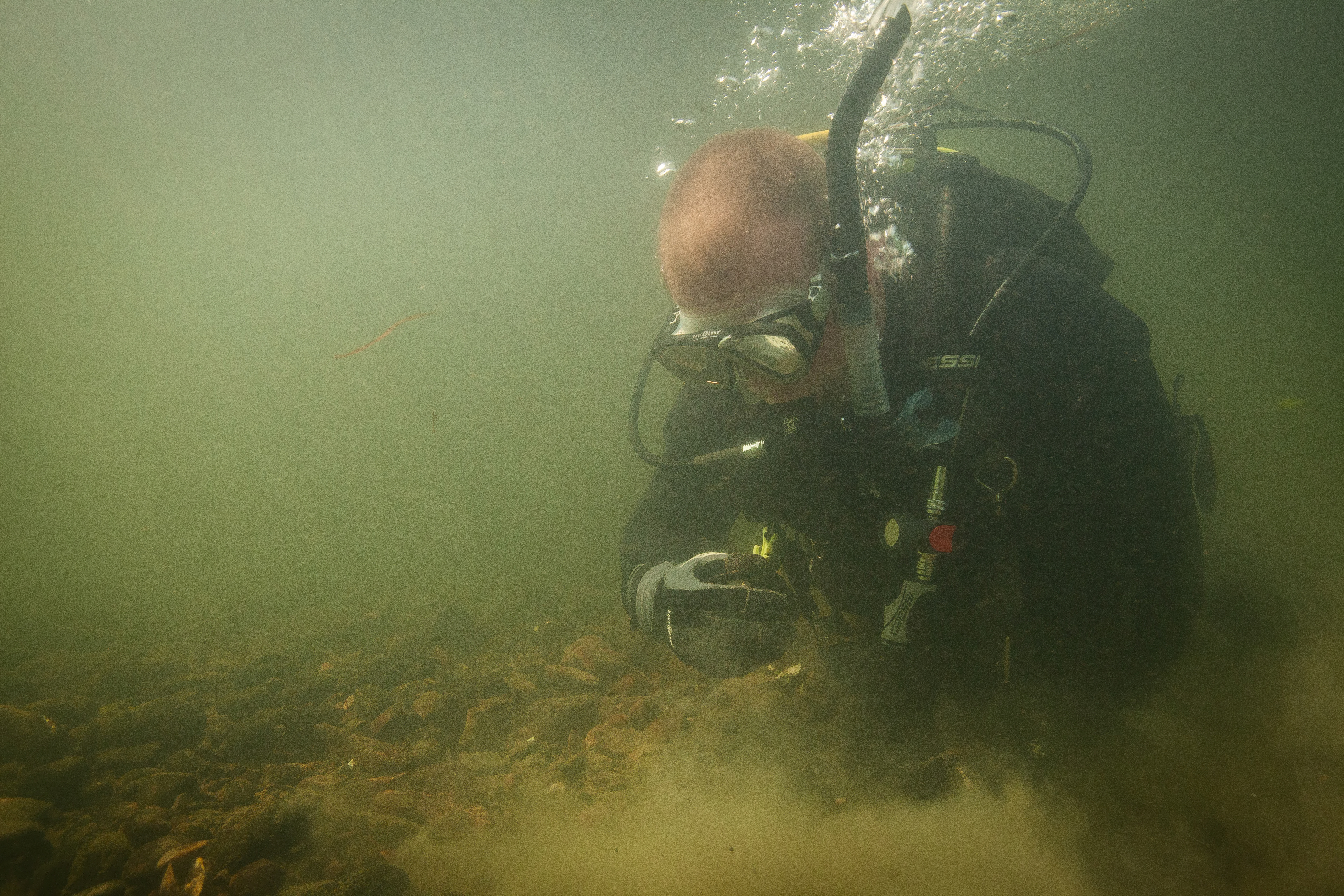 Diver salvages freshwater mussels on the Allegheny river before bridge replacement.