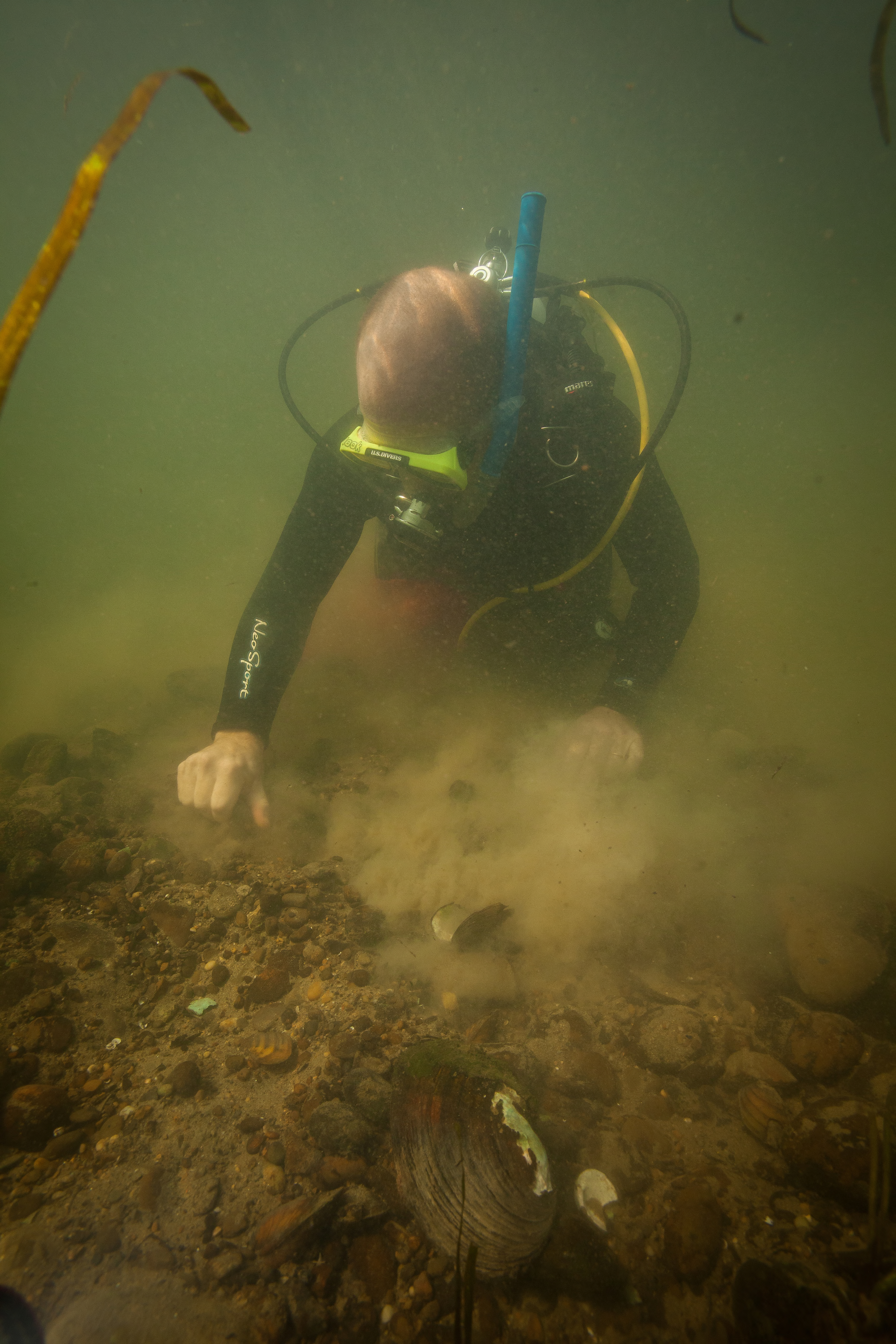 Diver collects freshwater mussels