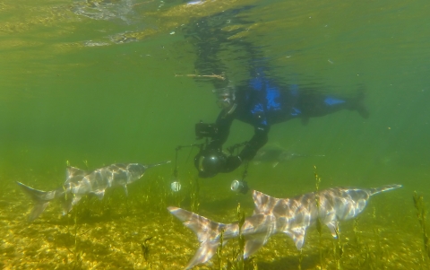 NCTC photographer, Ryan Hagerty, photographing paddlefish.