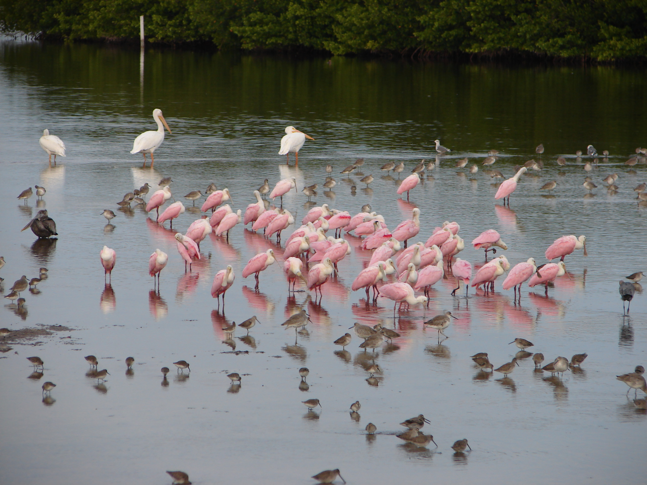 Several species of birds can be found at feeding time on the refuge, including Roseate spoonbills. This is a feeding frenzy for the lucky visitor, where all the birds frolic about trying to get a meal at once.