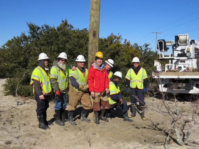 Refuge volunteer Reese Lukei, in the red jacket, poses with a crew from Dominion Virginia Power after they installed an osprey platform at Back Bay National Wildlife Refuge in Virginia.