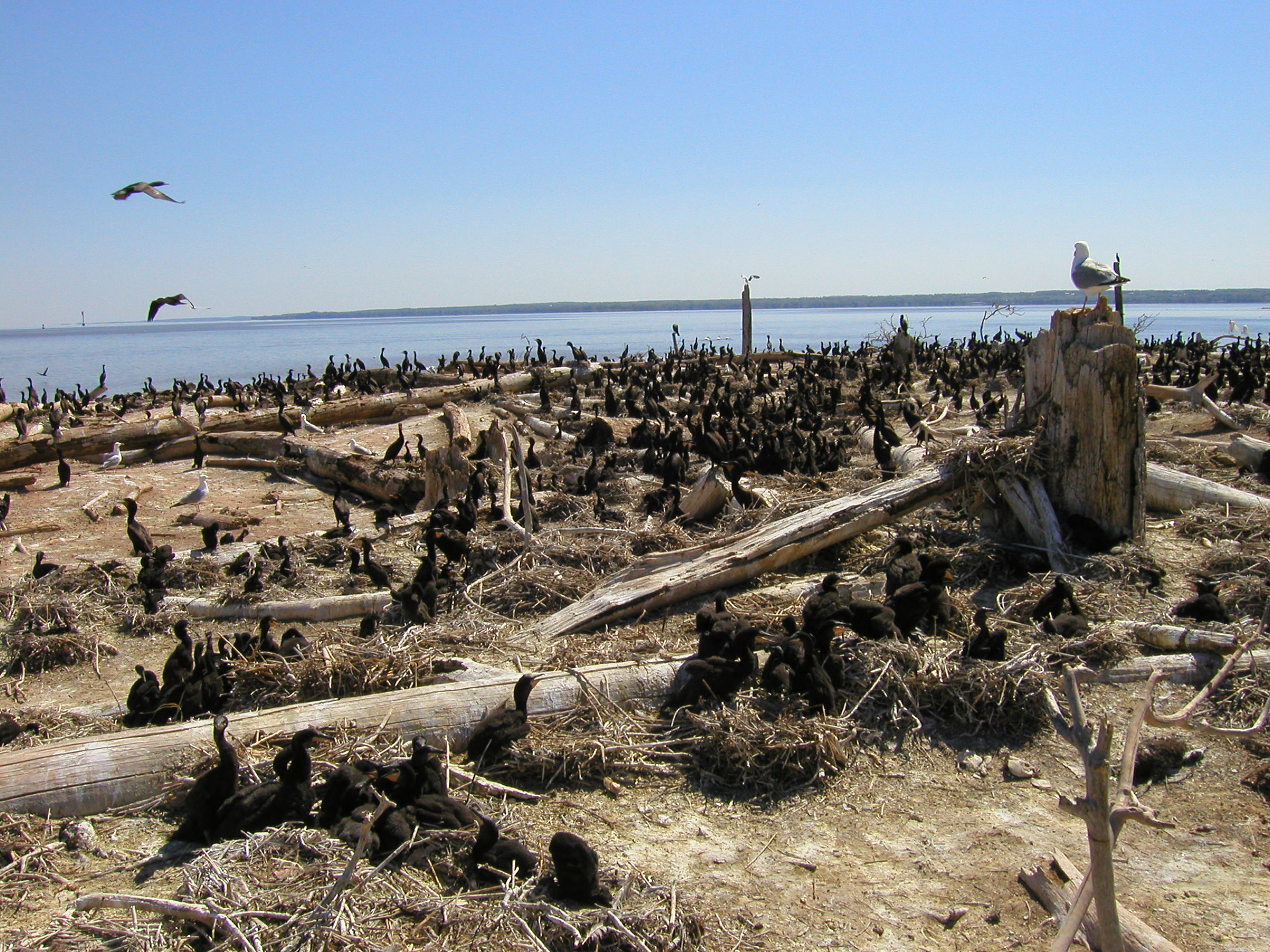 Double-crested cormorant chick colony near the water