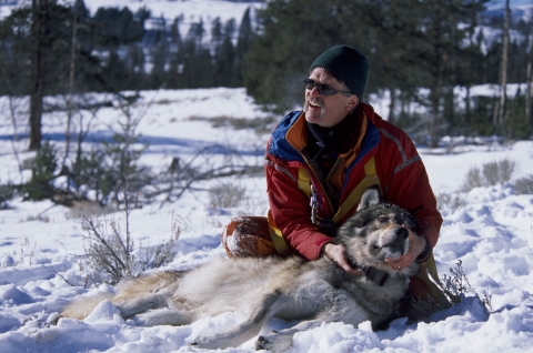 Yellowstone National Park wolf project leader Dr. Doug Smith checks the new radio collar on a tranquilized wolf during collaring operations in Yellowstone on 1-09-03. Higher resolution of this image not available.