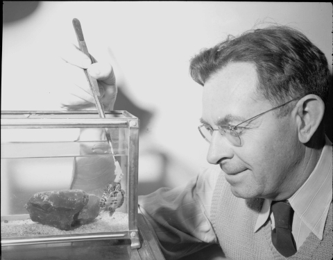 Dr. John C. Pearson Feeding a Two-headed Green River Turtle at the National Aquarium, 1949