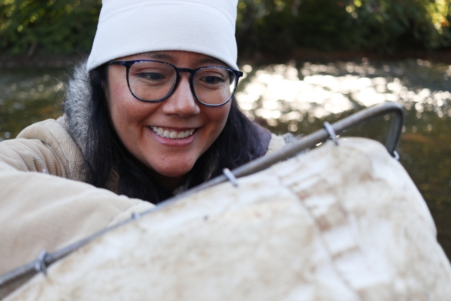 Dr. Natali Ramirez-Bullon with a kick net at the 2022 Toes in the Toe Festival, North Toe River, Spruce Pine, NC. dit: Gary Peeples. Copyright: Public domain.