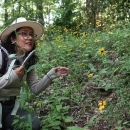Dr. Natali Ramirez-Bullon, U.S. Fish and Wildlife Service, searches for white irisette at Chimney Rock State Park, North Carolina.