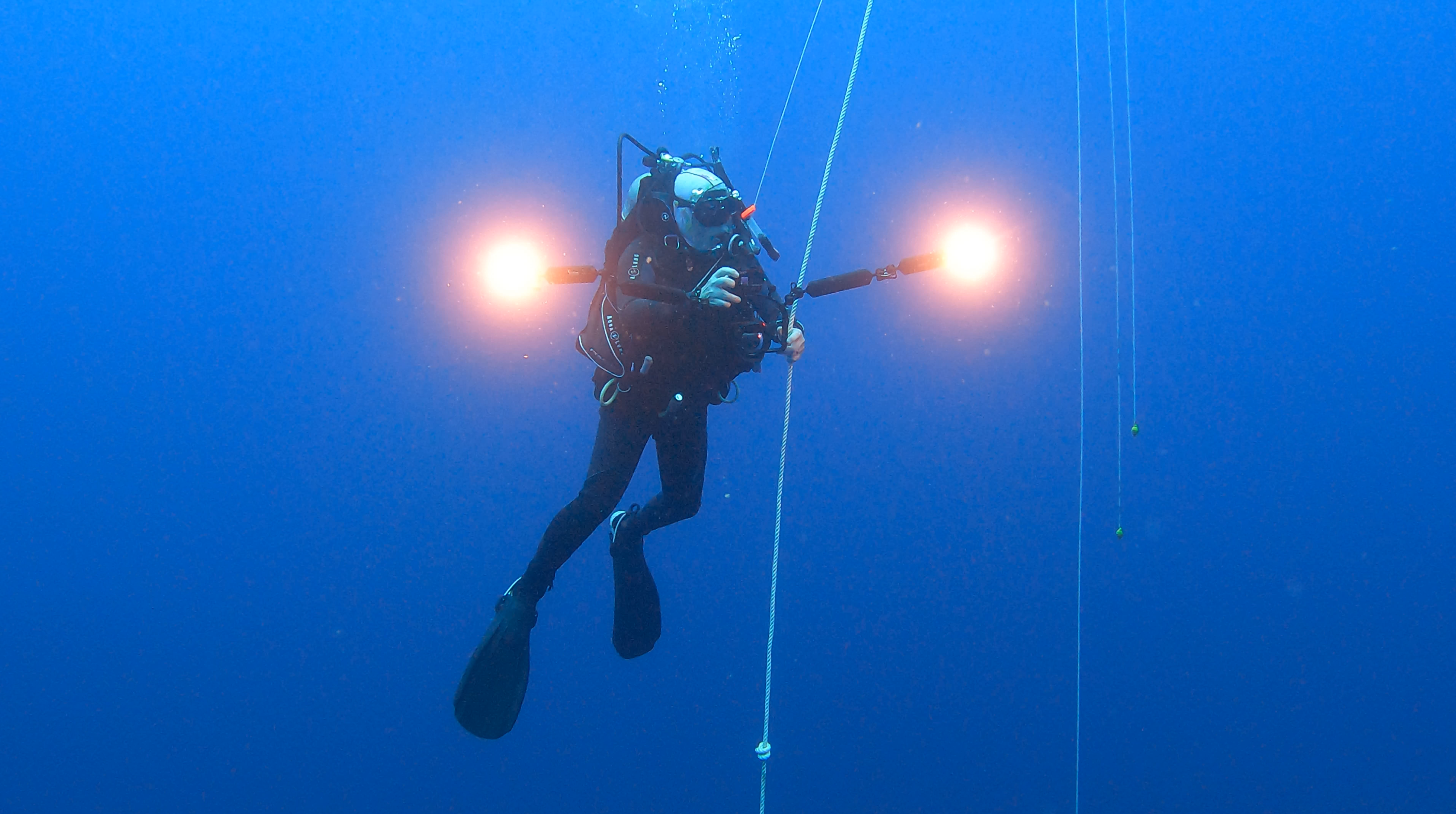 Dr. Peter Auster, weightless in the expanse of this undersea wilderness, pauses to take in the view at 25 m (85 ft) depth, with 1800 m (5940 ft) below him to the summit of Retriever Seamount during the Northeast Canyons and Seamounts Marine National Monument Expedition, 2024.