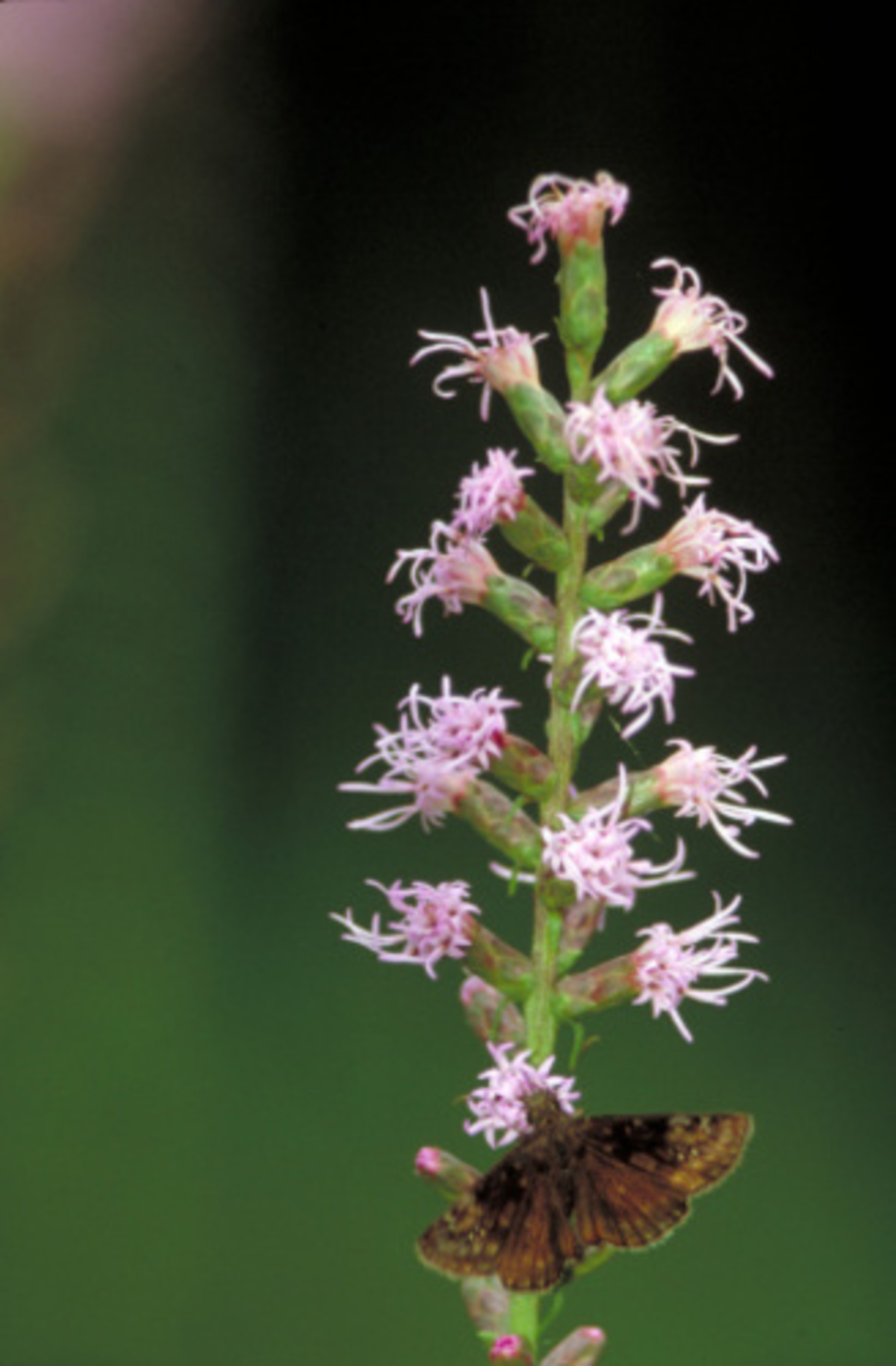 Small dark brown and tan butterfly near top of Dense blazing-star, viewed from above with wings spread.