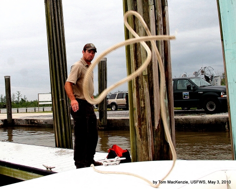 Drew Wirwa casts off the line to launch the twin-v 24 foot to motor to North Breton, part of Breton NWR.