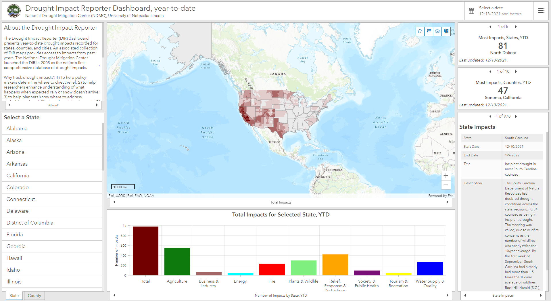 Data from the Drought Impact Reporter is displayed on a year-to-date dashboard. Users can explore data by impact type, impact type frequency, and state.