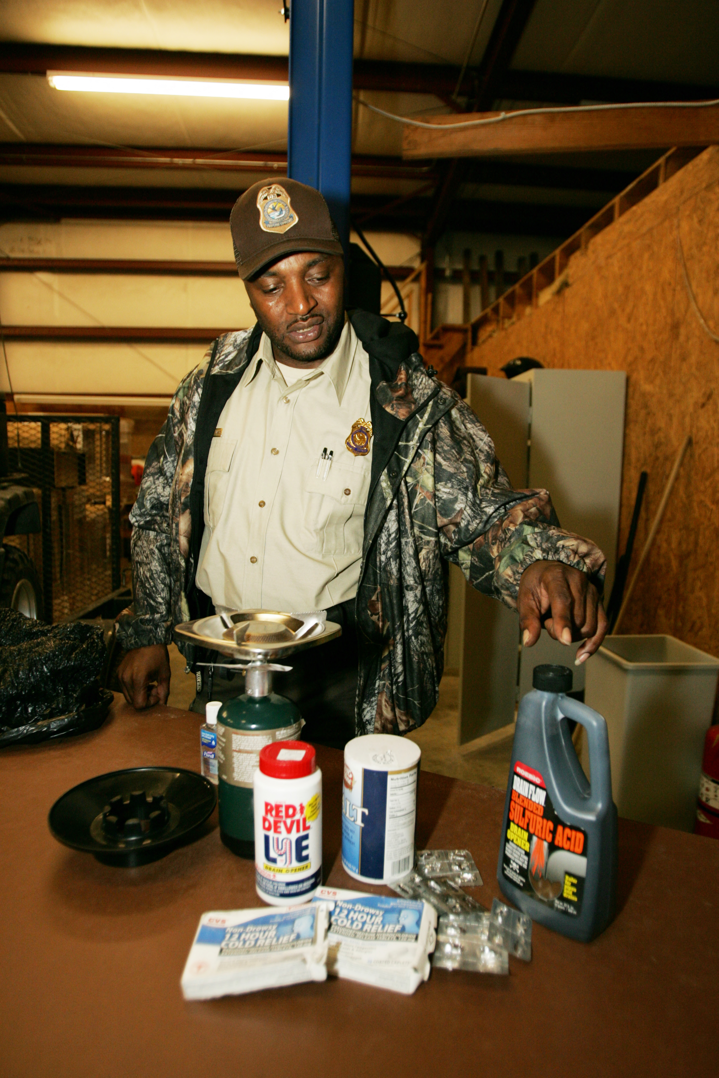 Law enforcement officer displays drug paraphanelia found on the refuge.