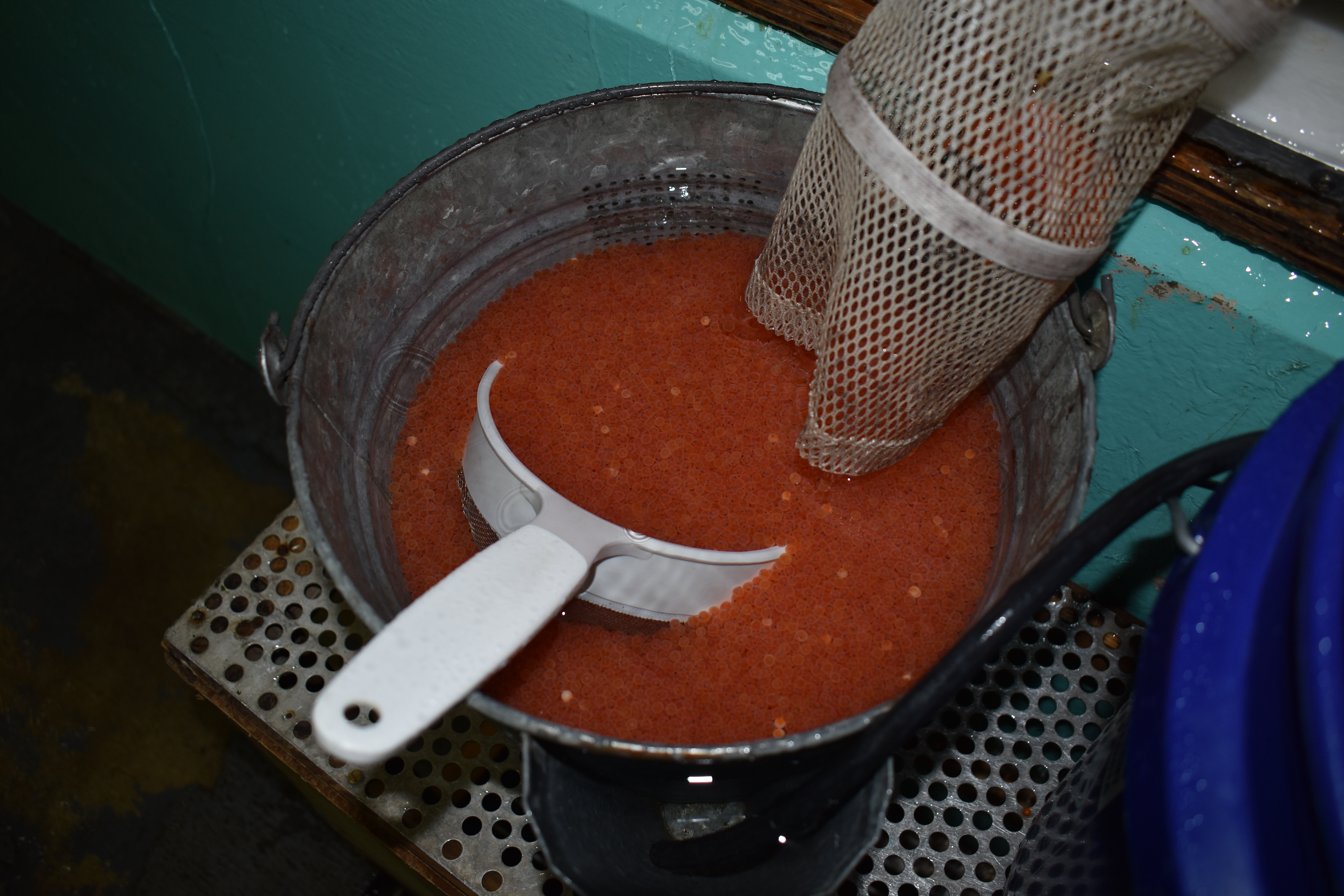 Thousands of live Rainbow trout eggs fresh out of the egg picking machine waiting to be processed for shipping.