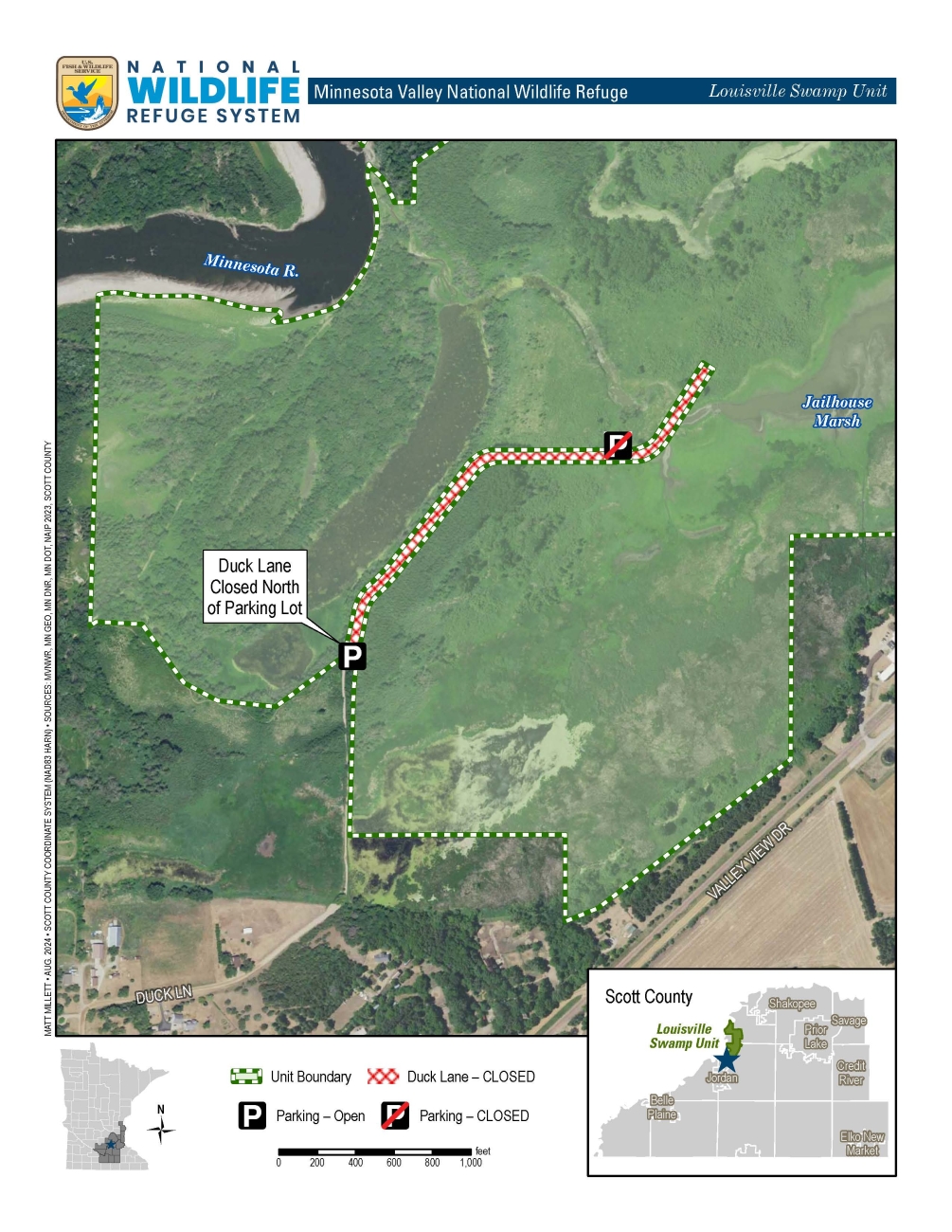Duck Lane Closure: Due to severe damages caused by regular flooding, Minnesota Valley National Wildlife Refuge has closed Duck Lane at Louisville Swamp for motorized vehicles past the first parking lot and gate. Visitors may continue to access refuge lands by parking in the initial lot and using a non-motorized means of transportation past this point.