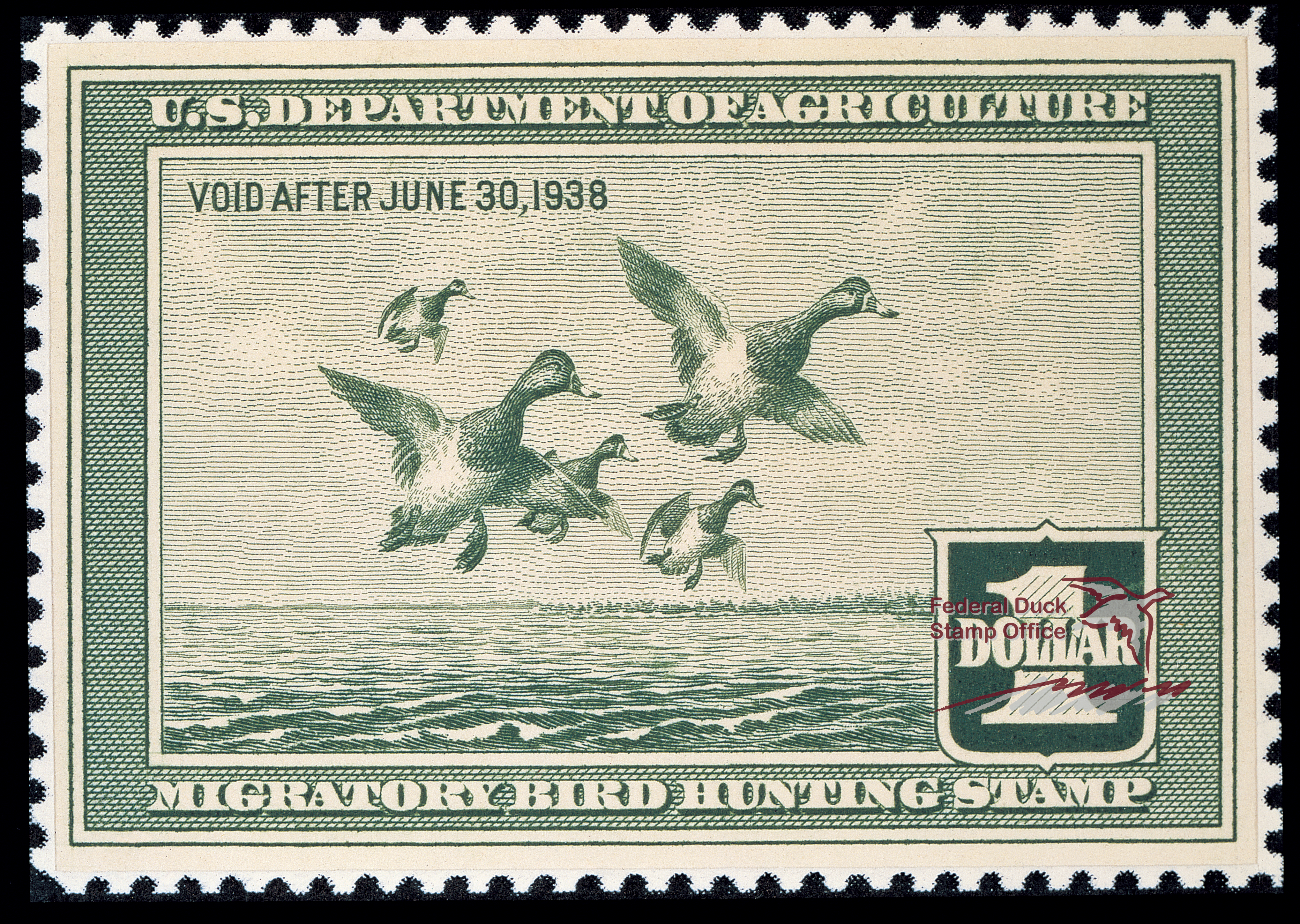 Inscription: Front - "U.S. Department of Agriculture. Void after June 30, 1938. Migratory Bird Hunting Stamp. 1 Dollar."