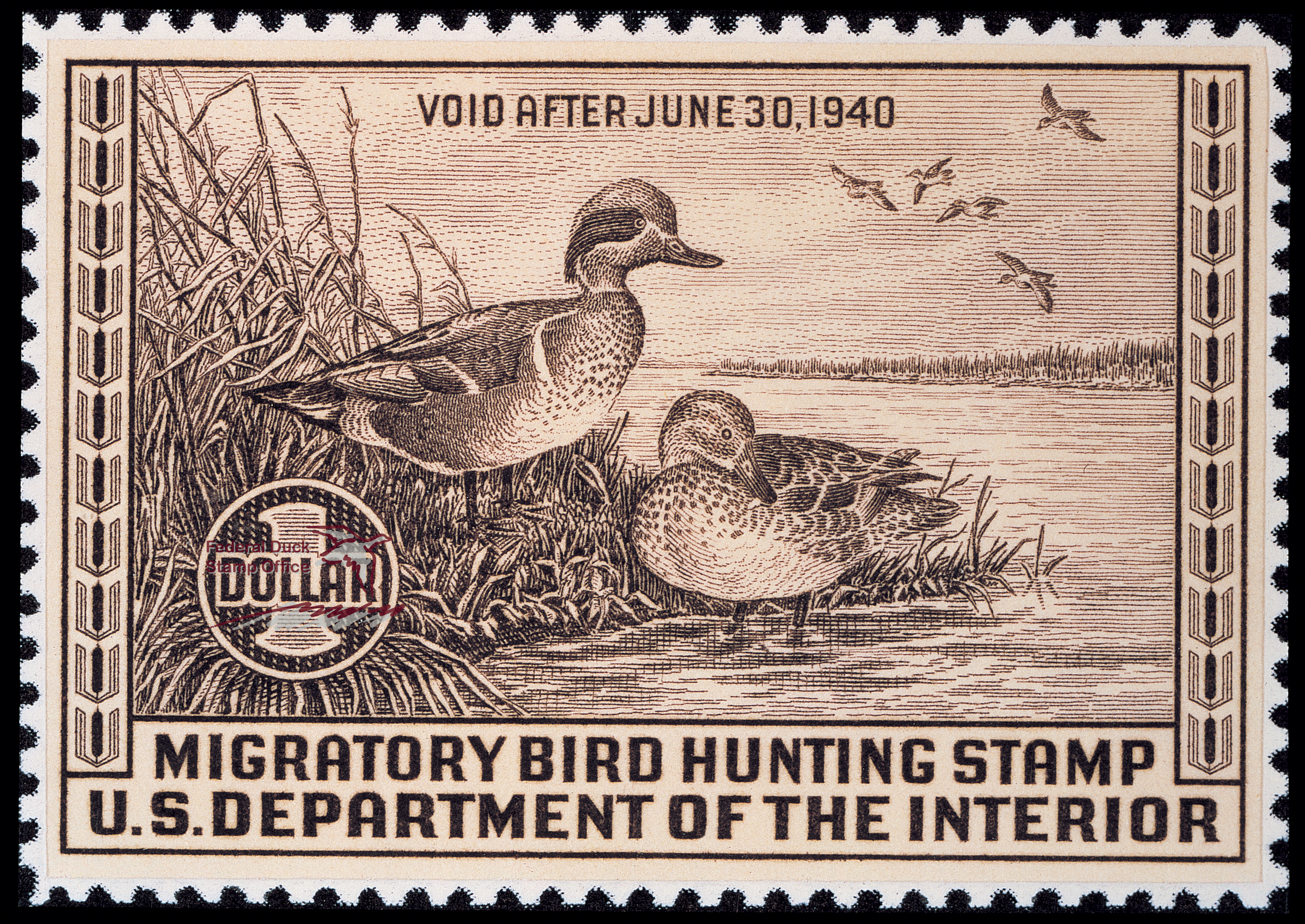 Inscription: Front - "U.S. Department of the Interior. Void after June 30, 1940. Migratory Bird Hunting Stamp. 1 Dollar." (Note: The Bureau of Biological Survey of the U.S. Department of Agriculture was transferred by Presidential order to the Department of the Interior on July 1, 1939. On July 1, 1940, the Bureau of Biological Survey and the Bureau of Fisheries were merged in the Department of the Interior to form the Fish and Wildlife Service.)