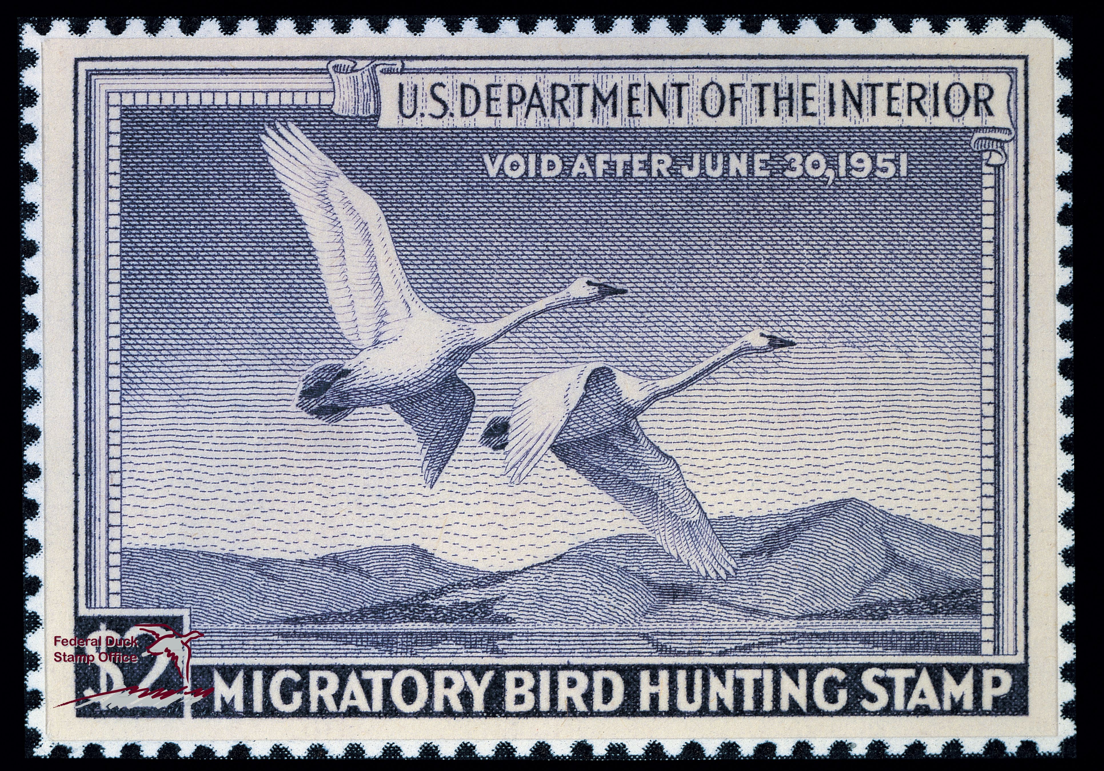 Inscription: Front - "U.S. Department of the Interior. Void after June 30, 1951. Migratory Bird Hunting Stamp. $2." Back - "It is unlawful to hunt waterfowl unless you sing your name in ink on the face of the stamp."