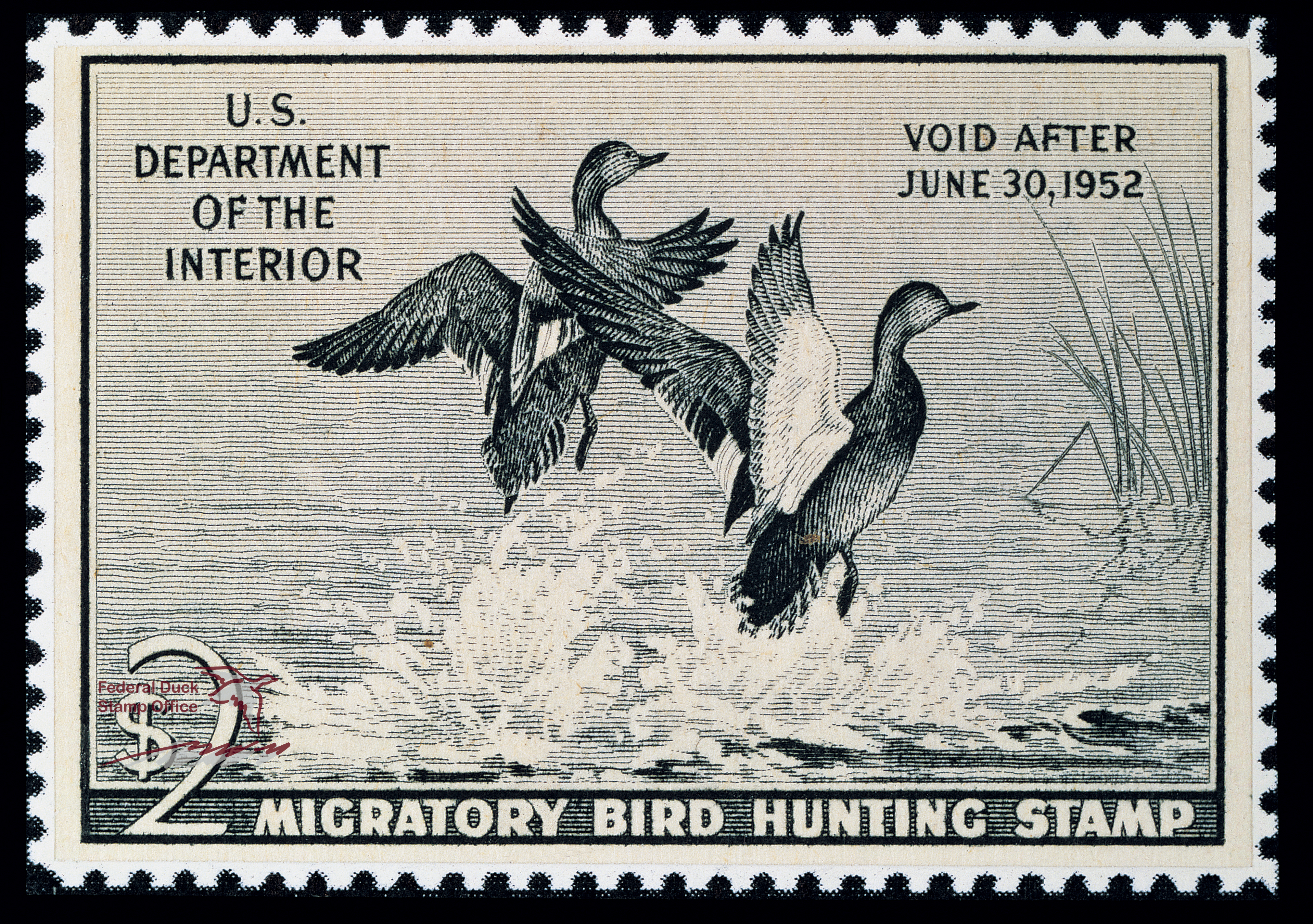 Inscription: Front - "U.S. Department of the Interior. Void after June 30, 1952. Migratory Bird Hunting Stamp. $2." Back - "It is unlawful to hunt waterfowl unless you sign your name in ink on the face of this stamp."