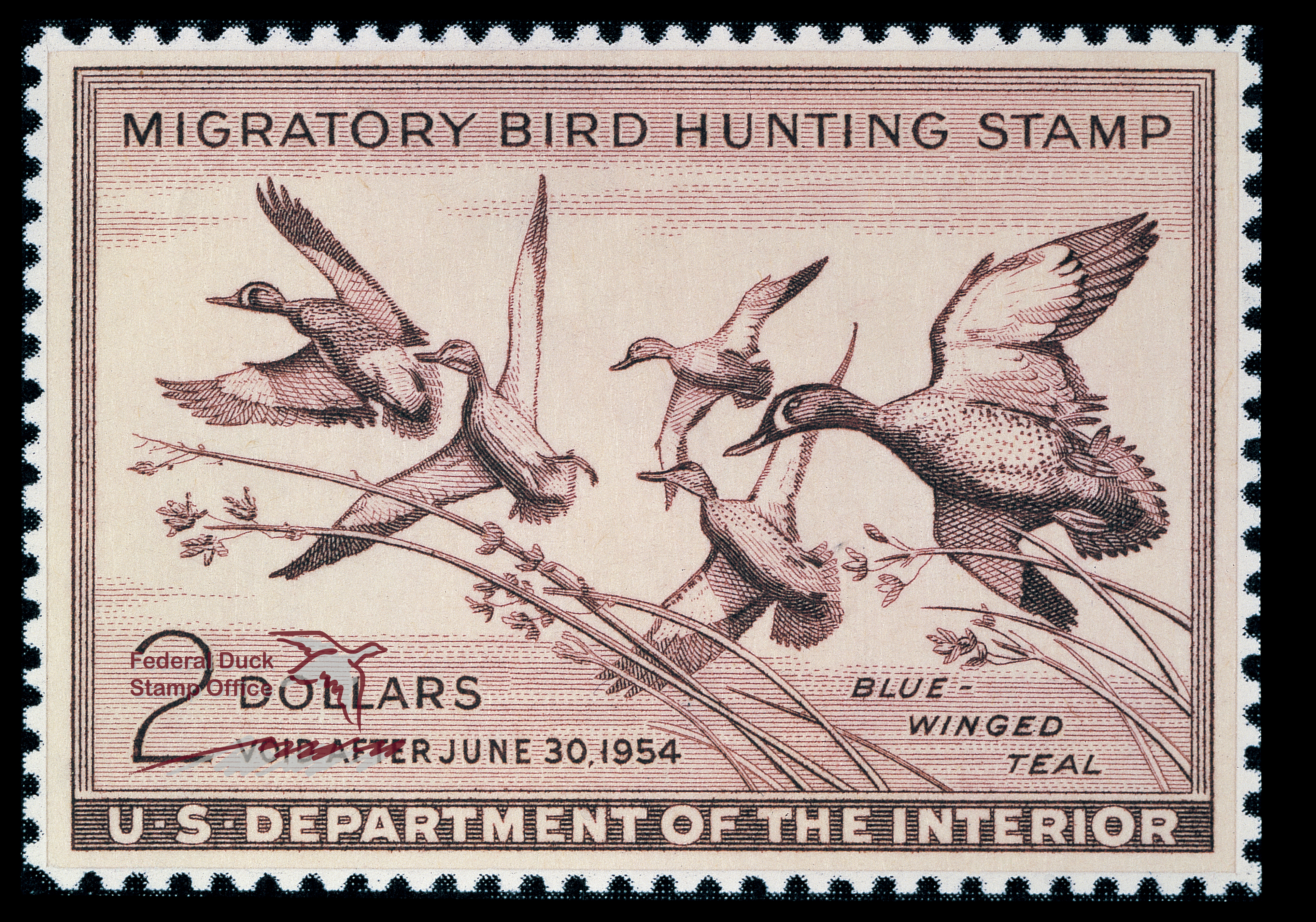 Inscription: Front - "U.S. Department of the Interior. Void after June 30, 1954. Migratory Bird Hunting Stamp. $2. Blue-winged Teal." Back - " It is unlawful to hunt waterfowl unless you sign your name in ink on the face of this stamp."