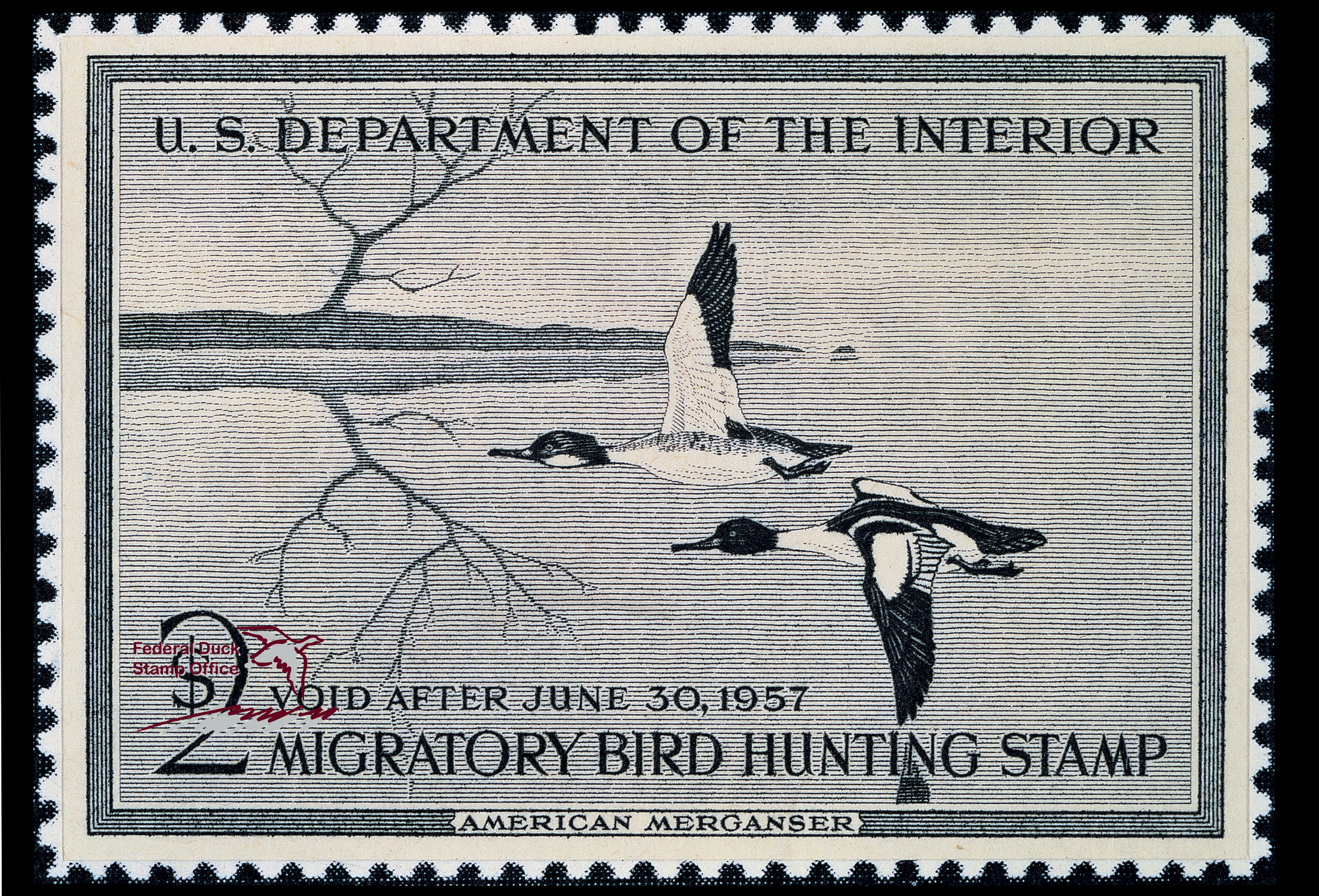 Inscription: Front - "U.S. Department of the Interior. Void after June 30, 1957. Migratory Bird Hunting Stamp. $2. American Merganser." Back - "It is unlawful to hunt waterfowl unless you sign your name in ink on the face of the stamp."