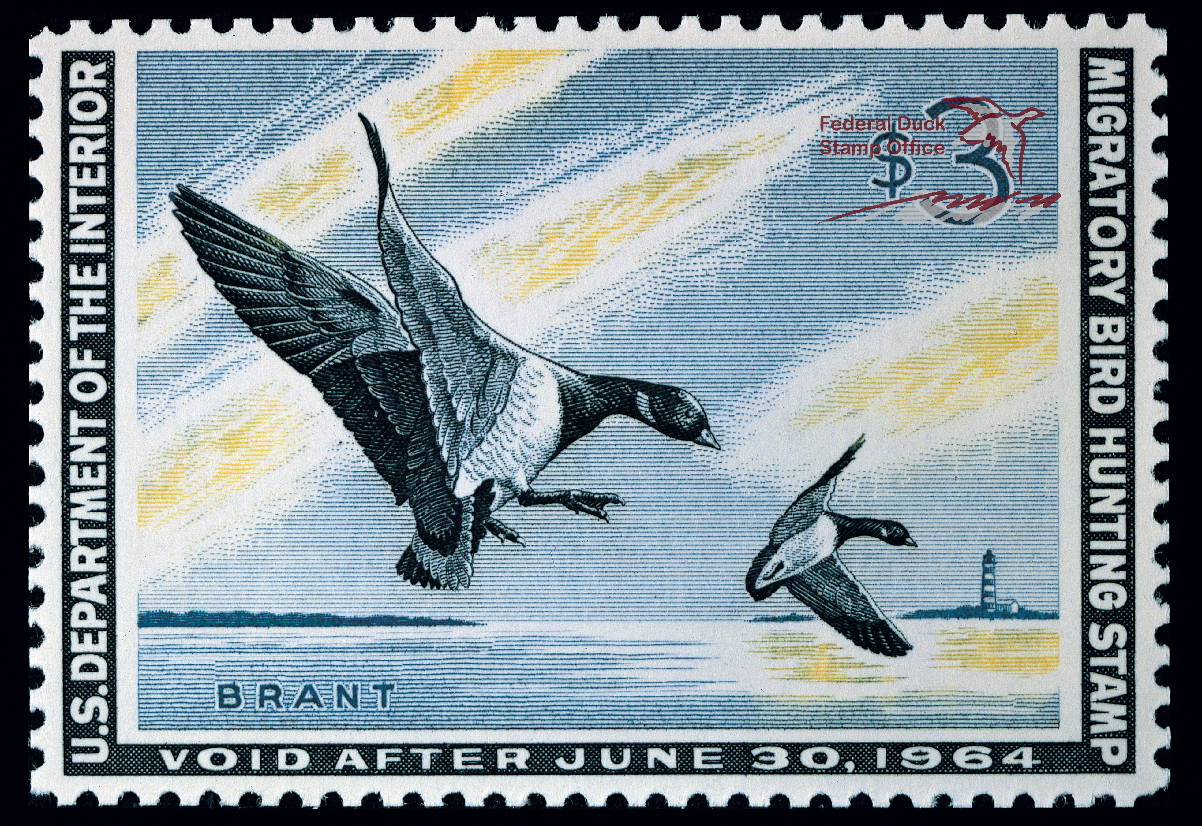 Inscription: Front - "U.S. Department of the Interior. Void after June 30, 1964. Migratory Bird Hunting Stamp. $3. Brant." Back - "Duck Stamps dollars buy wetlands to perpetuate waterfowl. It is unlawful to hunt waterfowl unless you sign your name in ink on the face of this stamp."
